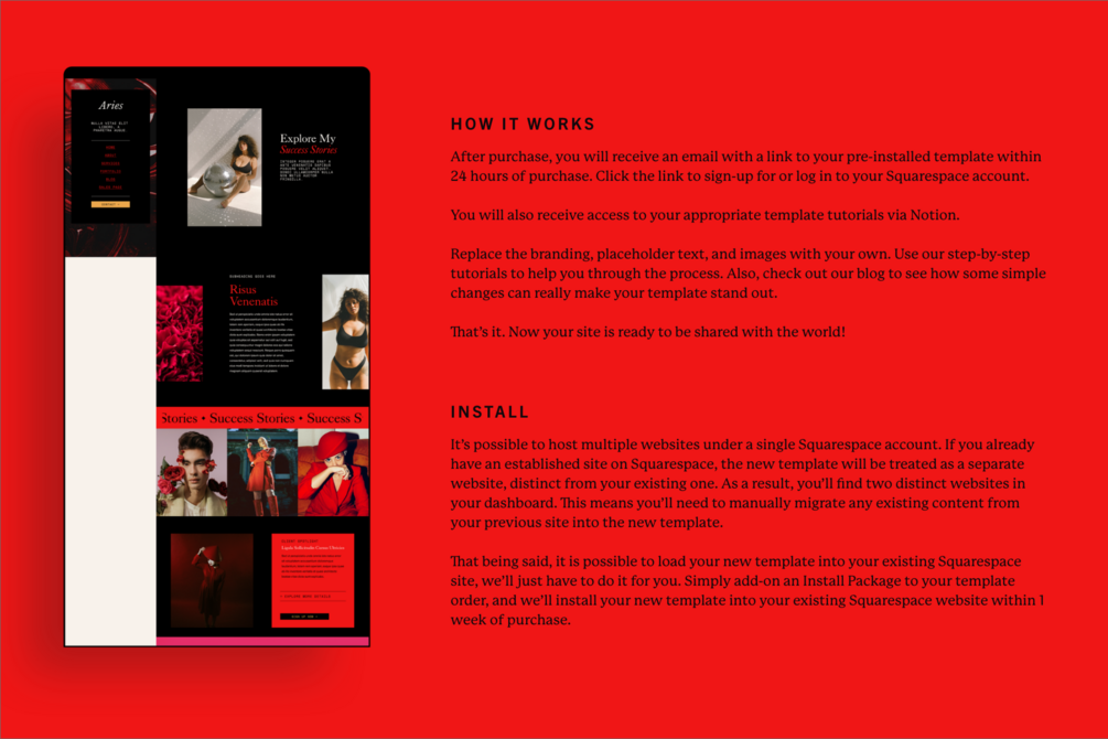 Once you have followed the instructions on the PDF, you will receive access to both your template and tutorial library on Squarespace. If you don't have a Squarespace account already, that's fine, when we send you the template it will prompt you to sign up!