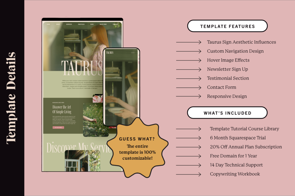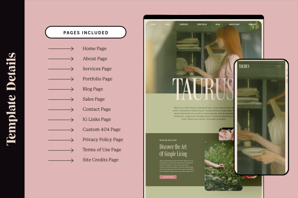 A modern website template for any spiritual entrepreneur. A dose of astrology mixed with design. The Taurus Squarespace Website Template is a uniquely intuitive design built to convert for any spiritual coach, podcaster, entrepreneur, brand, or small business. Includes access to The Website Copywriting Roadmap + Course Library as well.
