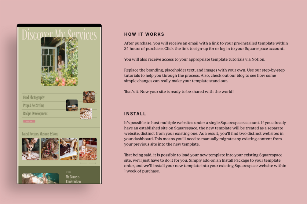 Once you have followed the instructions on the PDF, you will receive access to both your template and tutorial library on Squarespace. If you don't have a Squarespace account already, that's fine, when we send you the template it will prompt you to sign up!